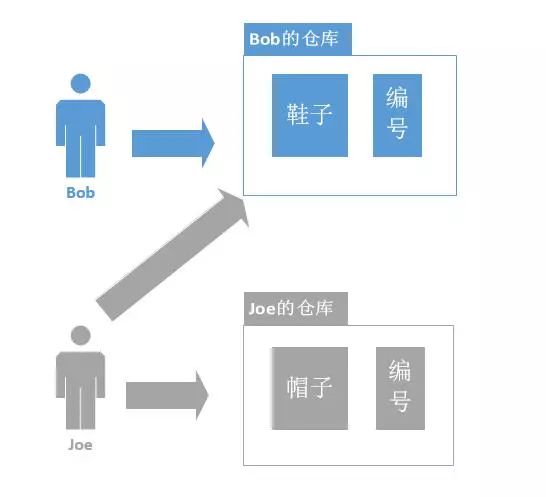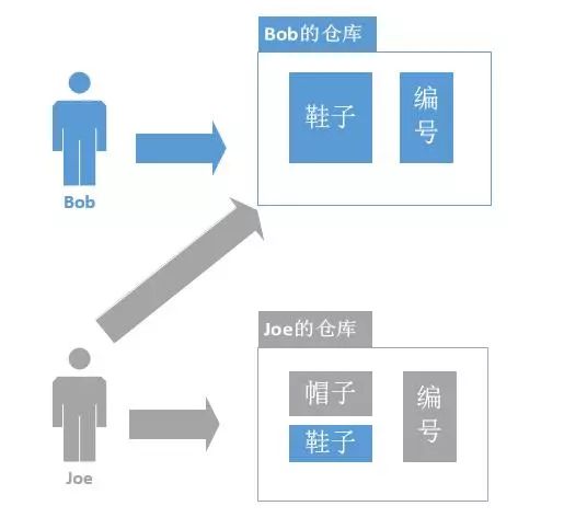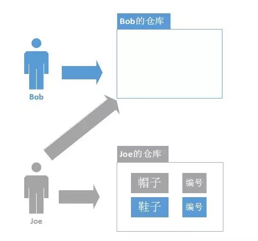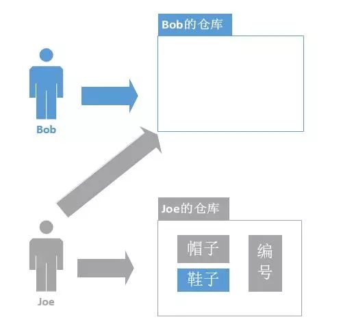 这时,Joe收到上级的授权和指示,去将Bob仓库中的鞋子都转移到Joe的仓库中,以后东西全部归Joe管理。