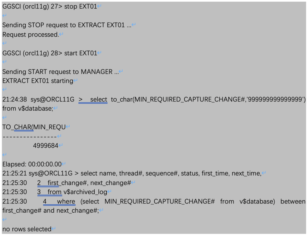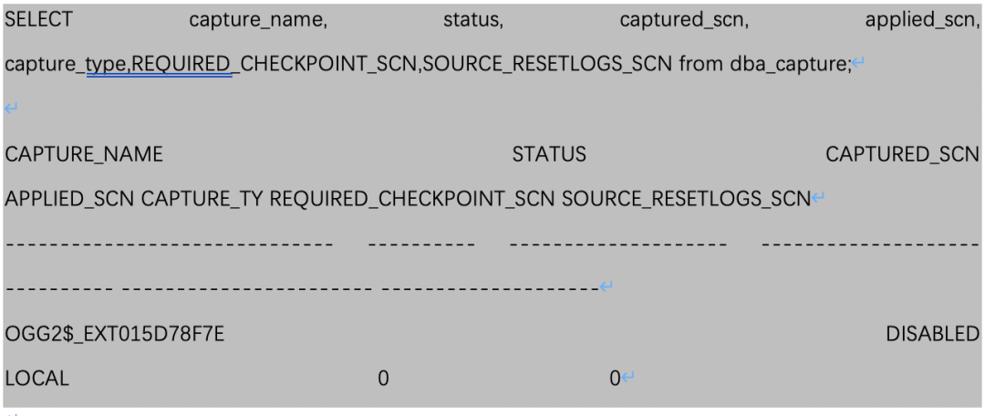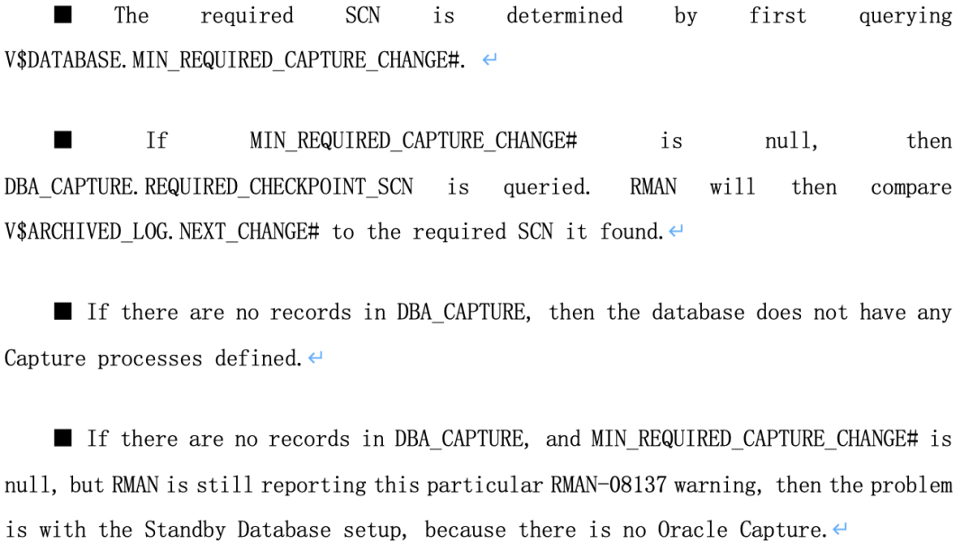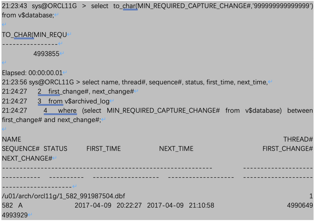 抽取进程所需的归档同时受V$DATABASE.MIN_REQUIRED_CAPTURE_CHANGE#和DBA_CAPTURE.REQUIRED_CHECKPOINT_SCN影响。
