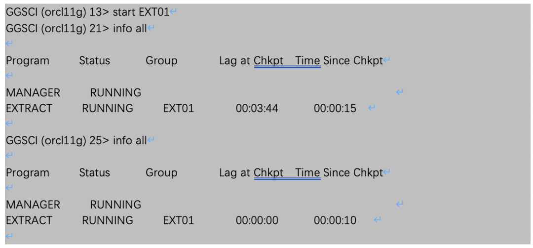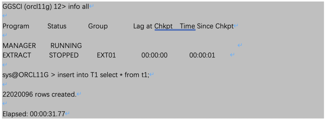 事务提交后,抽取进程有开始工作,但由于空间爆满所以进程abend,清理空间后再次拉起抽取进程,正常工作。