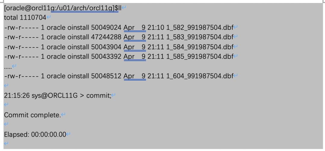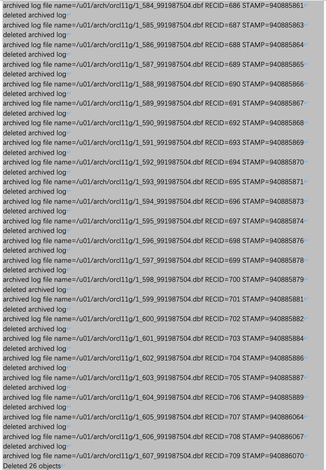 参照以上的命令我们做了LOGRETENTION注册,停止抽取进程,做个大事务,但不提交,试试归档日志能不能删除。