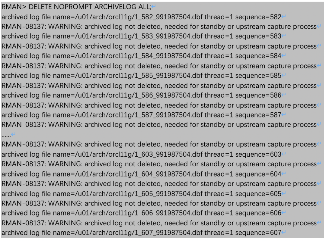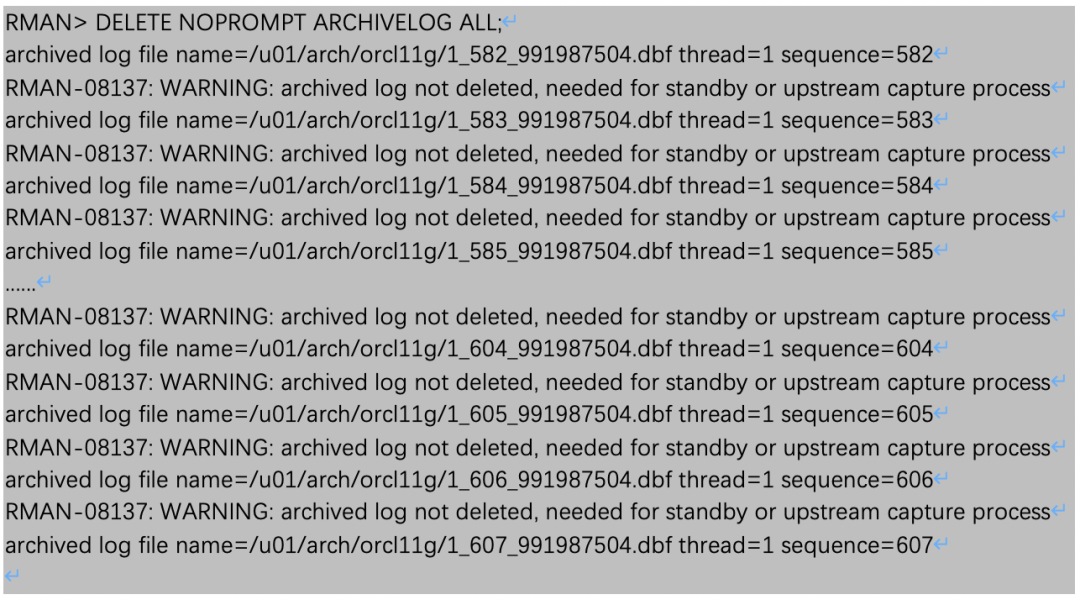 抽取进程先不启动,我们尝试通过rman删除归档,直接报无法删除。
