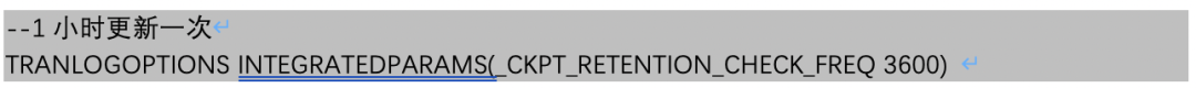 V$DATABASE.MIN_REQUIRED_CAPTURE_CHANGE#是由于抽取进程去负责更新的,默认是每6小时一次。可以通过参数TRANLOGOPTIONS INTEGRATEDPARAMS(_CKPT_RETENTION_CHECK_FREQ XXX)去指定。比如: