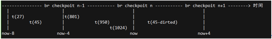 在br checkpoit n 时,假设有t(27)、t(45)、t(801)、t(950)、t(1024) 五个未提交事务,超过4小时的t(27)、t(45)会被br checkpoit n缓存到磁盘