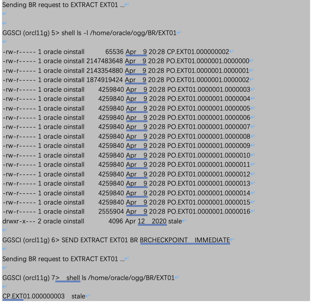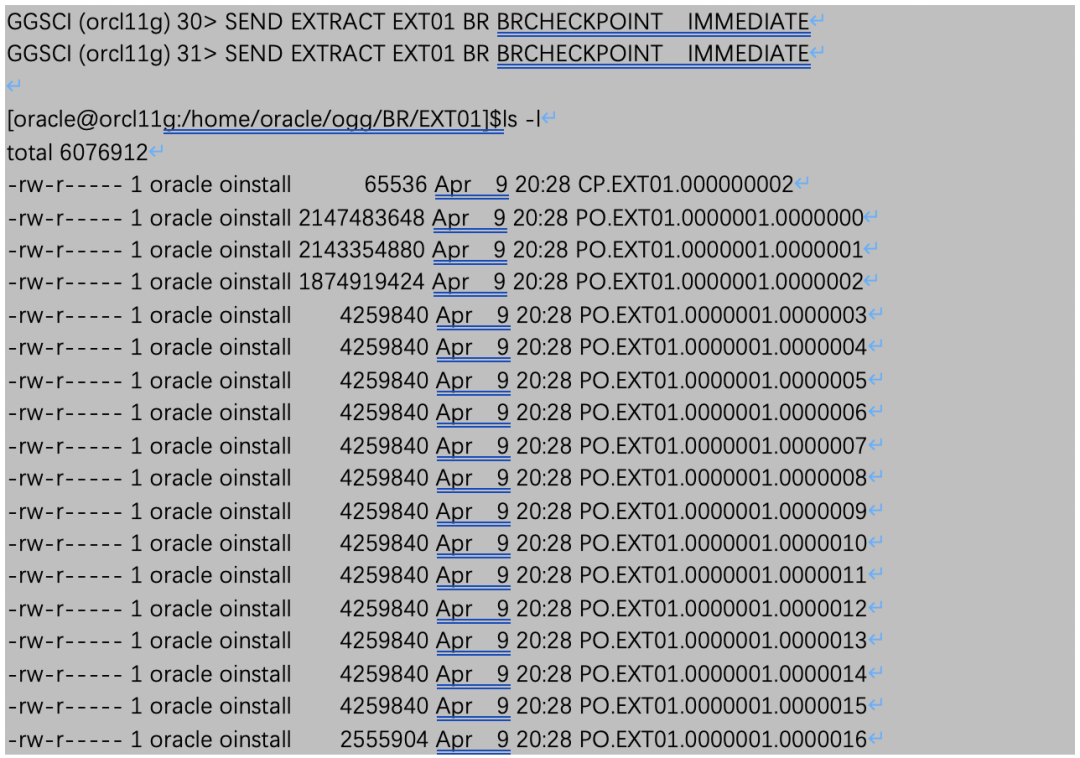 抽取进程追平后,可以看到BR目录事务的缓存文件还在。再次手动触发两次BR checkpoint,经历一次BR interval后缓存文件才会清理掉。