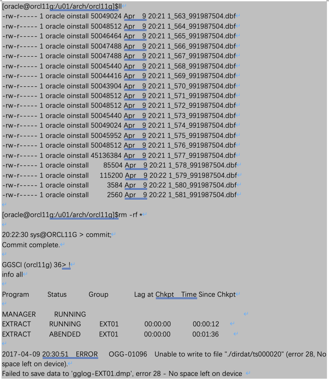 归档日志是ogg抽取进程的数据来源,意外的归档日志缺失,对抽取进程是一个致命打击。遇到归档丢失的情况,数据可能要重新初始化或者做数据对比和补数。