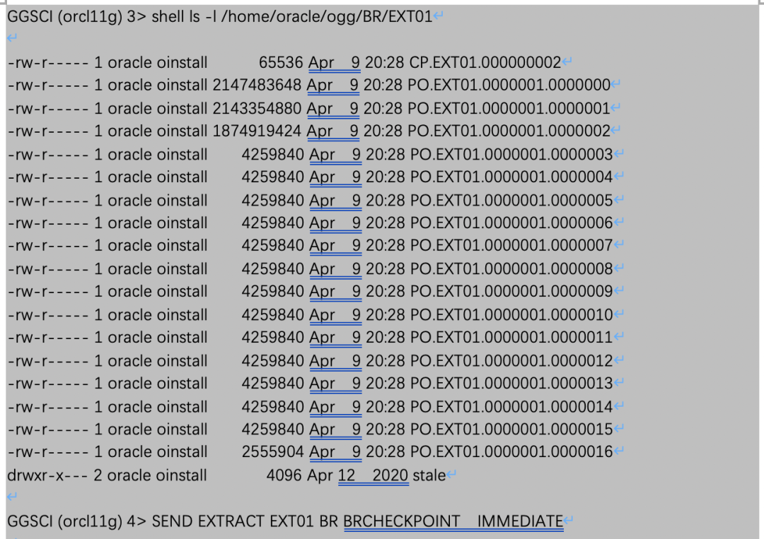 如果事务超过一个Bounded Recovery interval未提交,则会被认为是long-running open事务。由BR参数的BRINTERVAL选项指定(默认4小时),每4小时做一次BR检查点,默认保存在OGG安装目录的BR目录下(由于BRDIR指定)