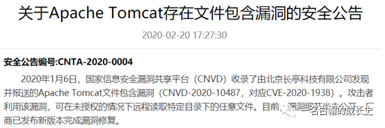 2月14日,Apache Tomcat官方发布了一个安全更新版本,用于修复Tomcat中存在的一个利用AJP协议的漏洞。利用该漏洞,攻击者可以通过发送恶意的AJP请求,在未授权的情况下读取或者包含webapp目录下的任意文件。