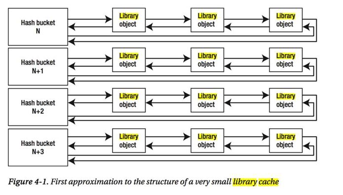 以上这图可看出library cache大体是由 hash bucket以及对应的library object handle双向链组建成的框架。