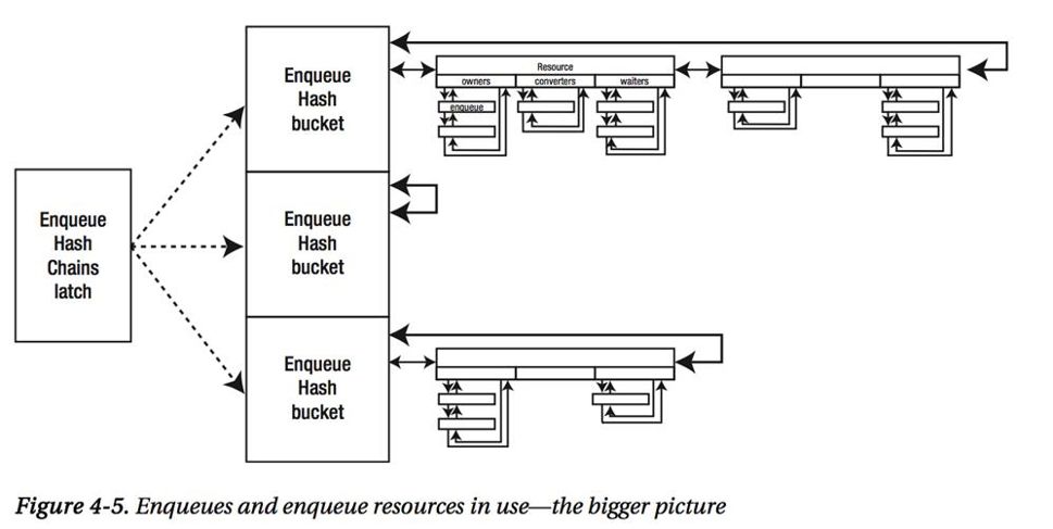 大体框架我们知道后,放大一点里面的构造,从以上图又可知道,一个latch管理多个hash bucket,然后一个hash bucket里的library object handle上的访问存在三种队列信息,包括owners\converters\waiters队列,它们存放着持有该handle资源、等待该handle资源的队列信息,其中converers理解为由等待变换成持有这个过程的队列信息。