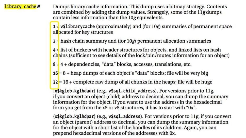 以上是library cache dump级别的官方说明,然后我们来做一次小测试如下: