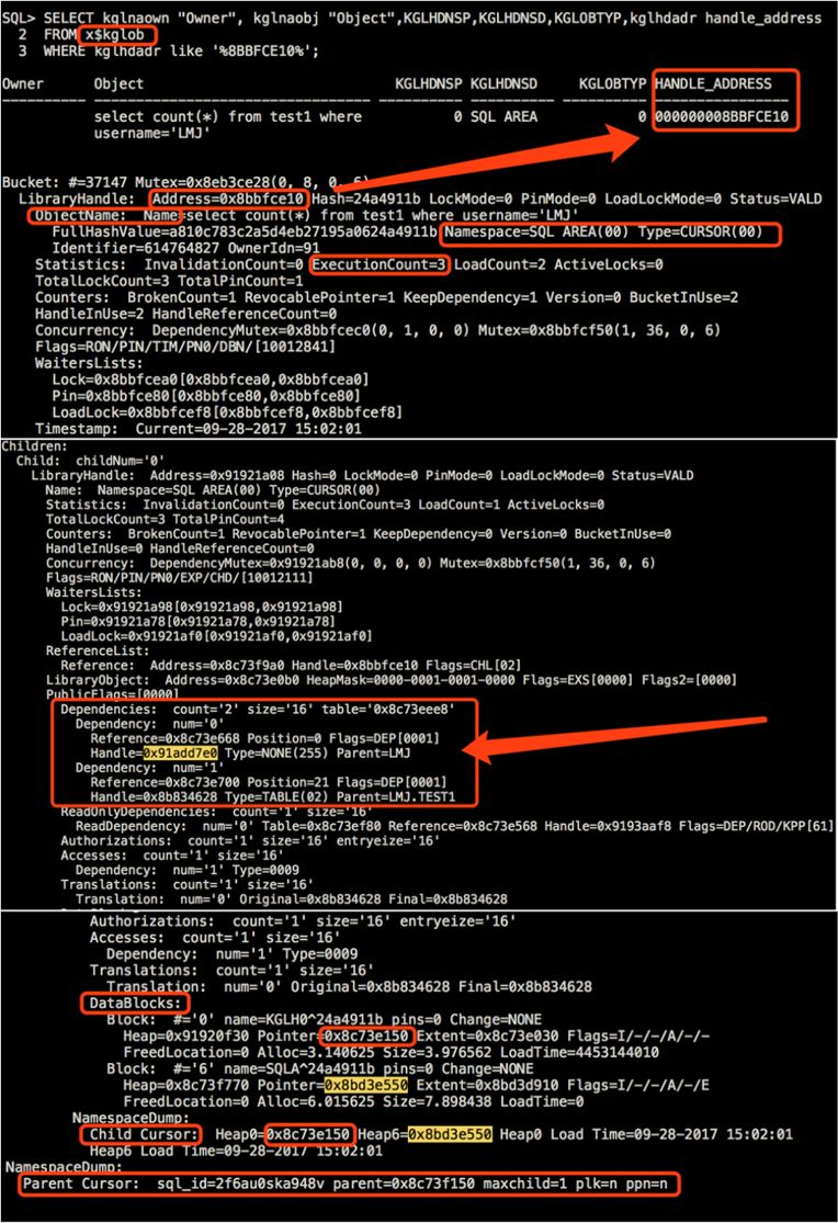 从以上三张图可知道,测试SQL被解释后存放在library cache里的bucket号37147里的library object handle上,handle地址为 0x8bbfce10,从这个handle地址的内容了解到以下内容: