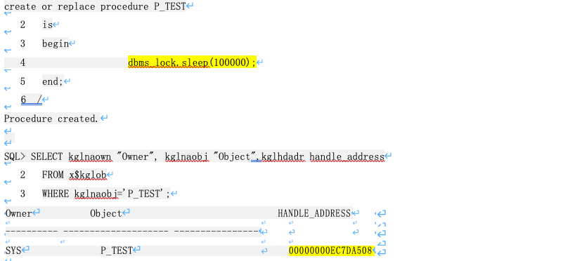 1、创建存储过程P_ TEST,并查询出其handle address SQL>