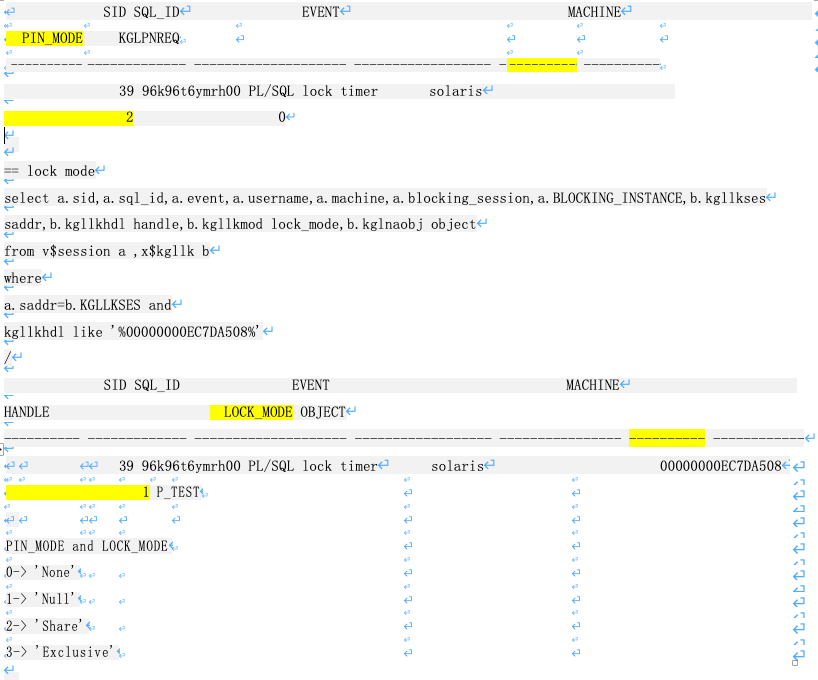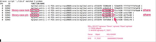 3、即最后结果是,会话39在library cache中p_test的handle address持有NULL模式的library cache lock和share模式的library cache pin。