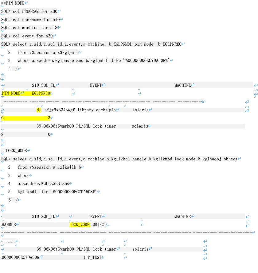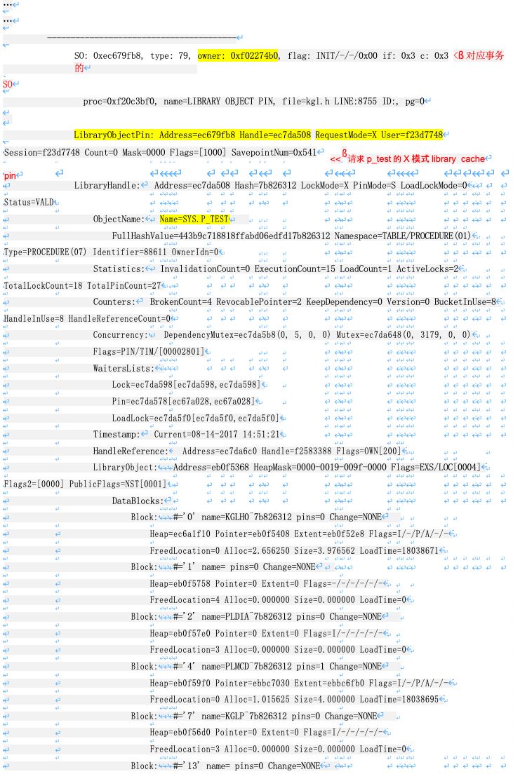 3、即最后结果是,会话41在library cache中p_test的handle address持有Exclusive模式的library cache lock,并申请 Exclusive模式的library cache pin处于等待状态。