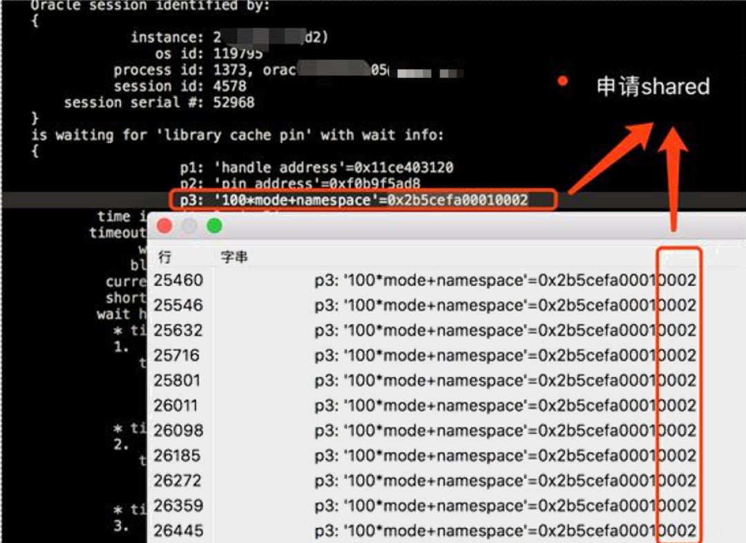分析library cache pin等待事件的p3(申请的锁模式),发现它们的共同点都是2,即这些被阻塞的会话想在XXXX.XX_PUBLIC申请shared 共享模式的锁,但被阻塞,由此可见有会话在XXXX.XX_PUBLIC上申请X排它模式的锁或持有X排它模式的锁未释放的情况,导致后面的会话无法申请shared共享锁而只能等待。