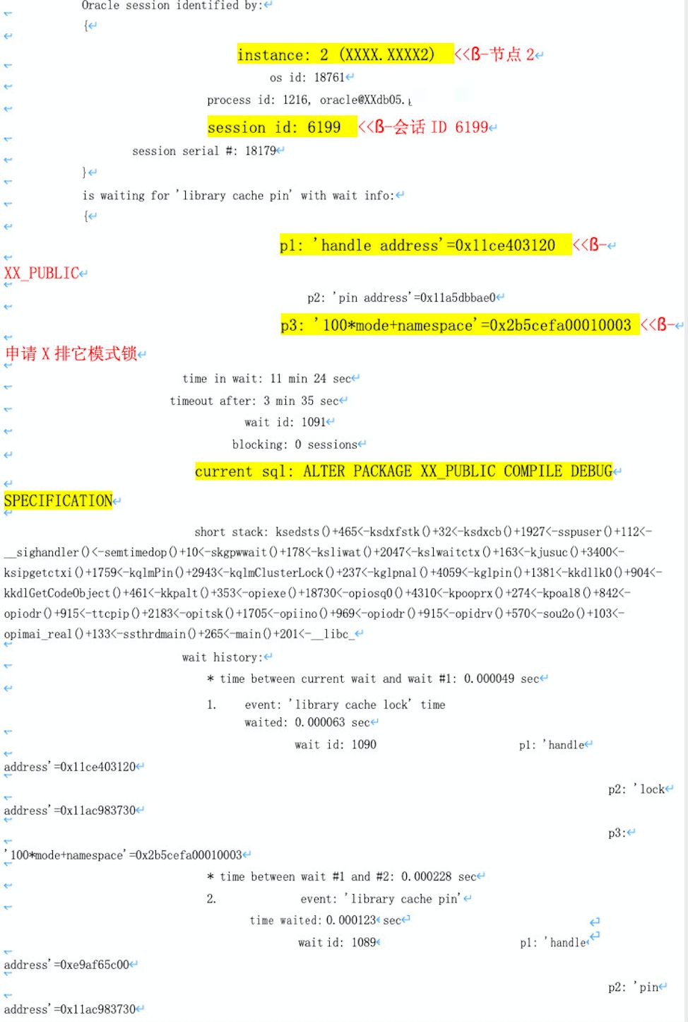 (1) 15:46:08 节点2的会话6199对应的应用机器发起了对XXXX.XX_PUBLIC编译的DDL操作,导致从15:46:08 开始,节点1、2、3的会话无法共享访问XXXX.XX_PUBLIC而出现library cache pin等待事件。