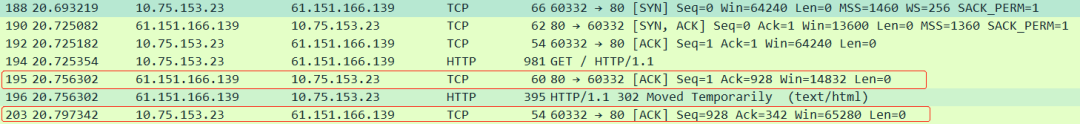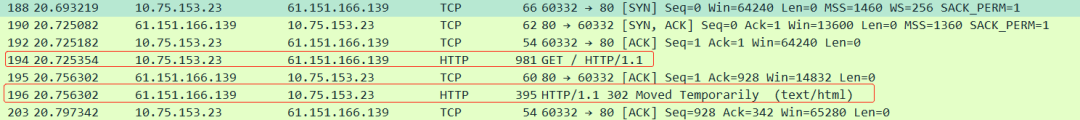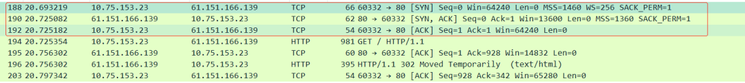 可以看到主机先向目标网站80端口(HTTP服务)发起TCP三层握手: