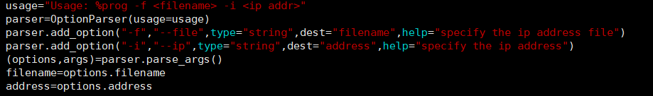 第四行同理,利用add_option()方法添加选项-i和--ip。