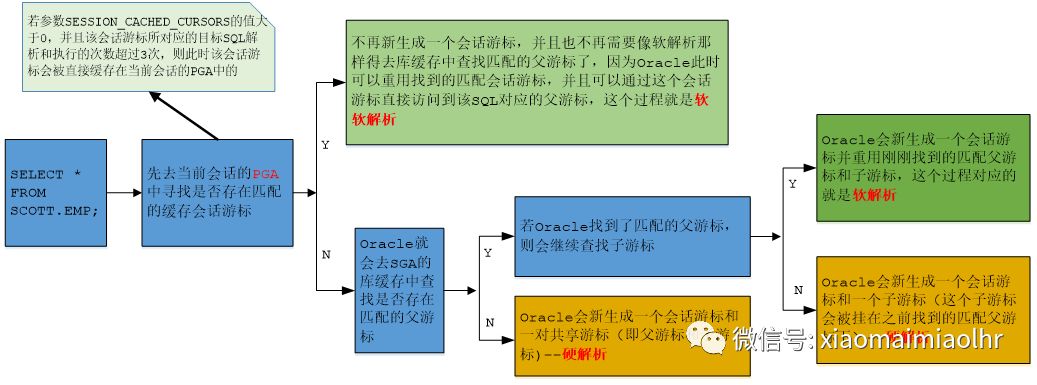 l 无论是硬解析、软解析还是软软解析,Oracle在解析和执行目标SQL时,始终会先去当前会话(Session)的PGA中寻找是否存在匹配的缓存会话游标。