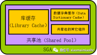 在介绍游标之前先介绍一下Oracle数据库中库缓存(Library Cache)的作用及其组成结构。库缓存是SGA中共享池(Shared Pool)中的一块内存区域,主要作用就是缓存执行过的SQL语句和PL/SQL语句(例如存储过程、函数、包、触发器)及其所对应的解析树(Parse Tree)和执行计划等信息。当同样的SQL语句和PL/SQL语句再次被执行的时候就可以直接利用已经缓存在库缓存中的那些相关对象而无须再次从头开始解析,这样就提高了这些SQL语句和PL/SQL语句在重复执行时的执行效率。库缓存(Library Cache)在SGA中的位置如下图所示: