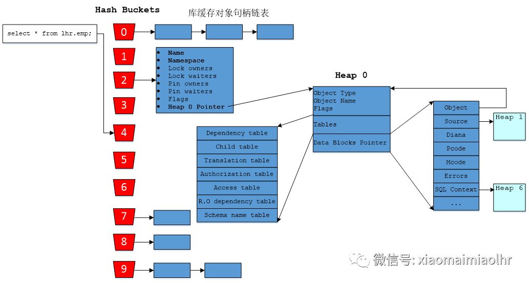 l 库缓存对象句柄(Library Cache Object Handle):所有的库缓存对象都是以一种名为库缓存对象句柄的结构存储在库缓存中,Oracle是通过访问相关的库缓存对象句柄来访问对应的库缓存对象的。所以,要访问库缓存对象,就需要先访问库缓存对象句柄。库缓存对象句柄是Oracle自定义的一种复杂的C语言结构。由于库缓存对象句柄是以哈希表(Hash Table)的方式存储在库缓存中的,哈希表就是很多Hash Bucket组成的数组,所以,Oracle会通过相关的哈希运算来存储和访问对应的库缓存对象句柄。