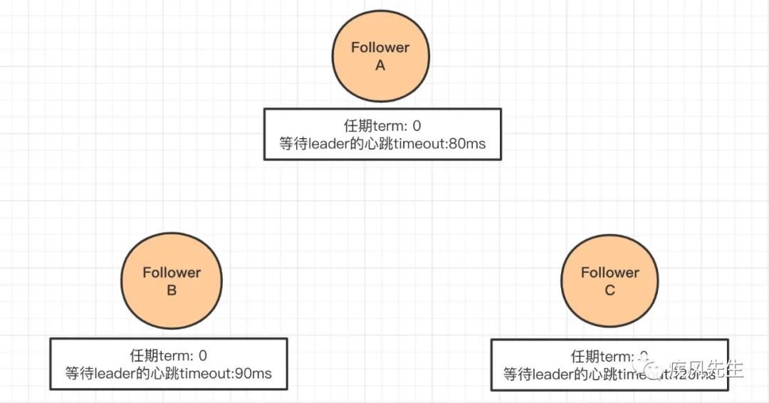 Raft算法集群节点服务的初始化状态均为Follower节点,并且每一个Follower节点具备成为Leader节点的资格,也就是说可以同时具备存储数据以及集群Leader的特征,其次Follower节点都拥有一个随机等待leader节点发起ping心跳检测的超时时间timeout