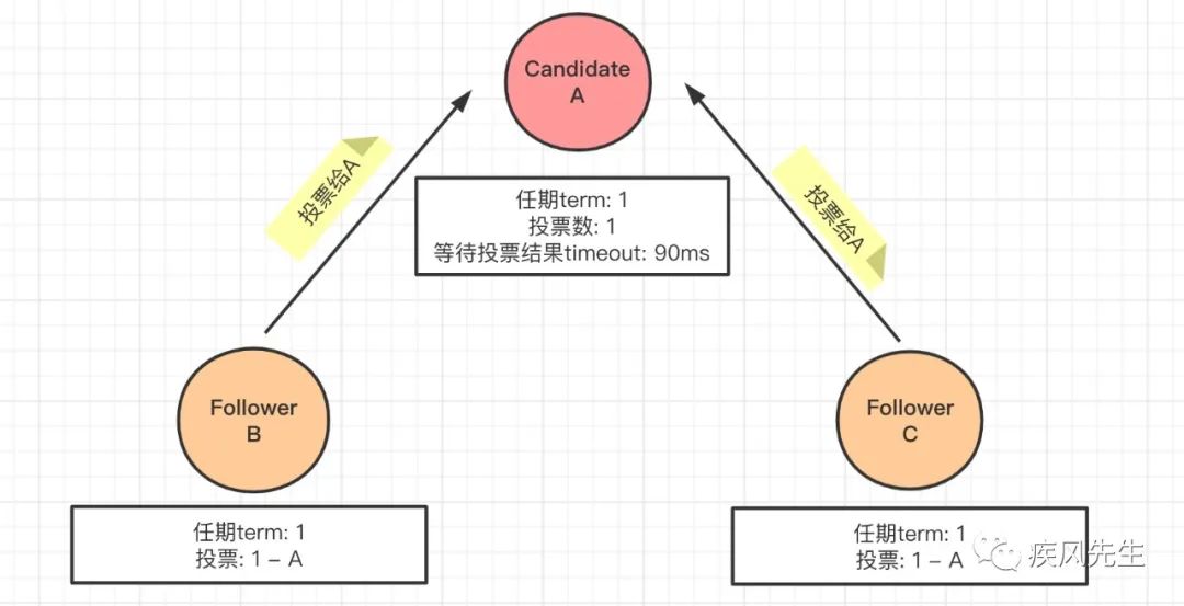 如果是在timeout时间内,集群的服务节点B以及C接收到候选节点A的RPC投票请求并且此时还没有接收到其他服务节点的投票请求,那么就会更新当前的任期编号为1,同时将投票给A服务节点并给予响应,即: