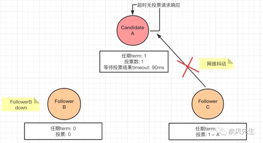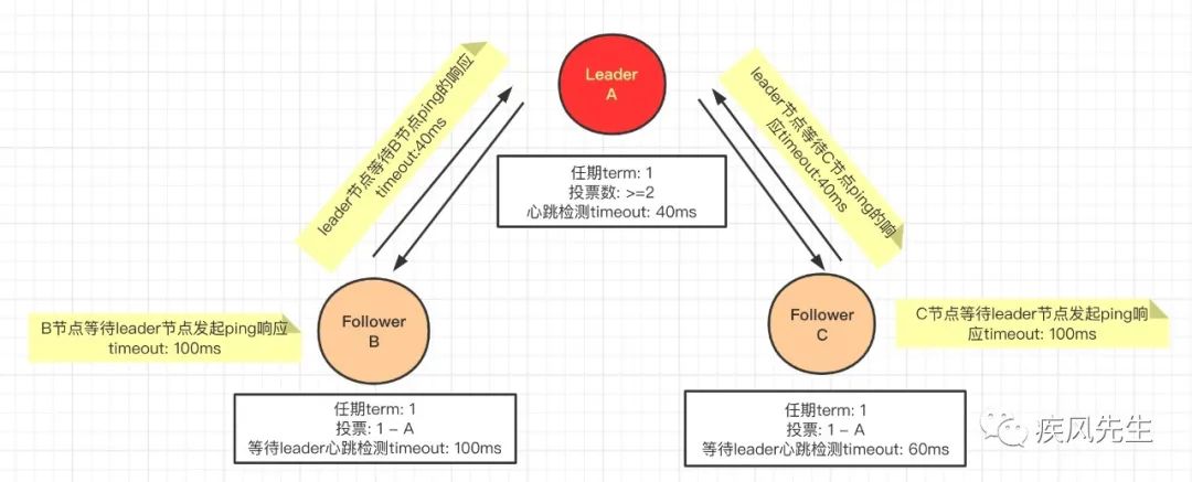 超时Timeout: 具备两种含义,即包含leader心跳检测超时以及候选节点等待选举结果超时.