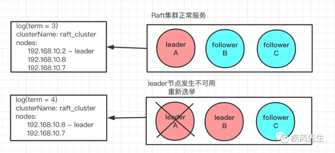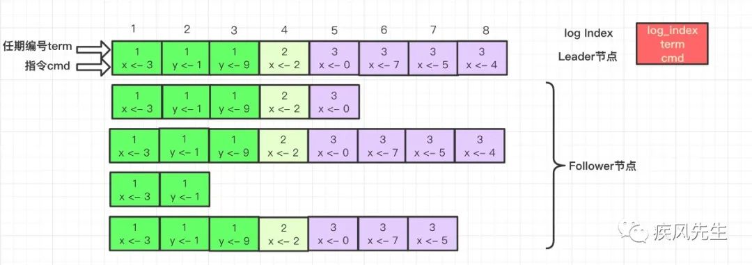 任期Term: leader选举存在任期Term,每次完成leader选举会更新一次任期Term.