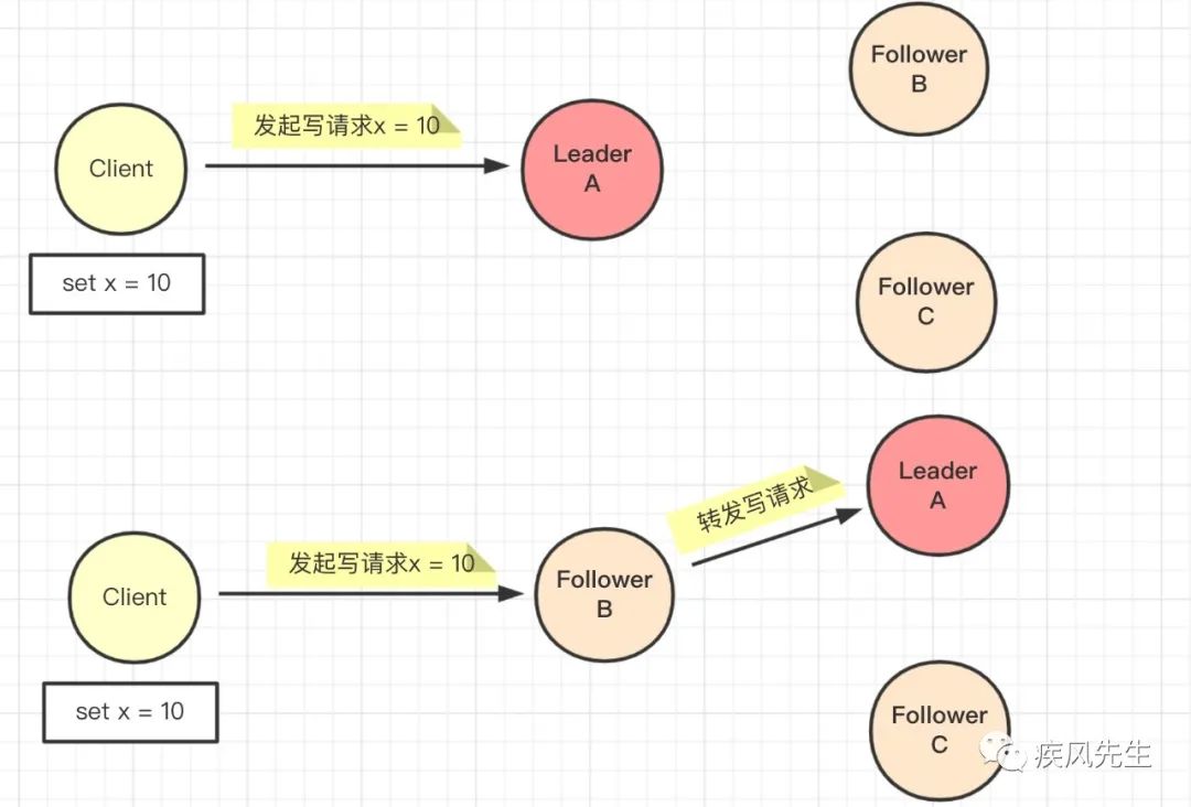 客户端服务client service向Raft集群服务发起事务请求操作,将转发由Raft集群的leader节点进行事务请求的写入以此来保证Raft集群服务的共识问题,假设客户端服务发起写请求操作 set x=10