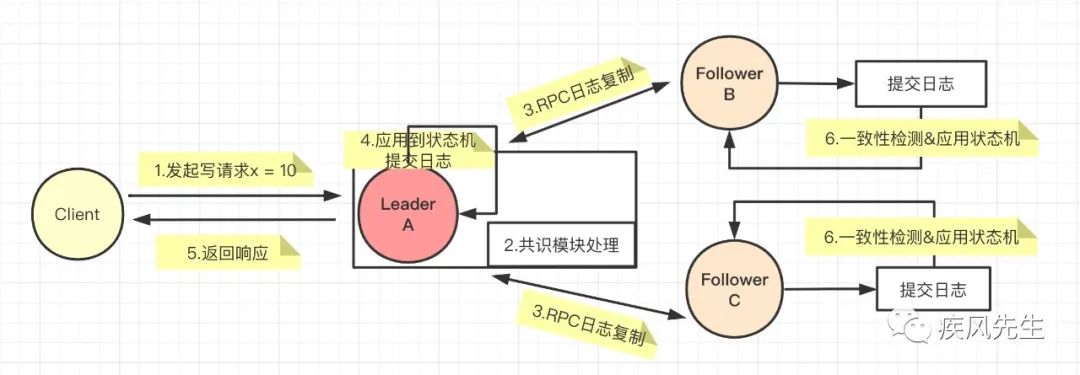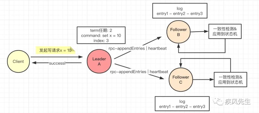 到follower节点,follower节点会进行一致性检查流程并将日志项提交到本地状态机以保证与leader节点的日志数据一致.即: