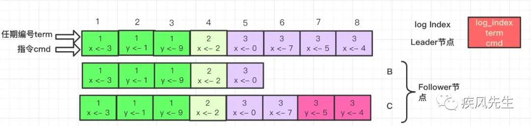 日志完整性高的follower节点拒绝投票给日志完整性低的候选节点.假设现在Raft集群服务提交的日志log如下(其中包含日志索引logIndex,实体log包含任期编号term以及变更的指令):
