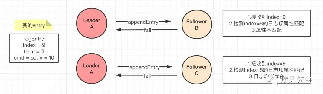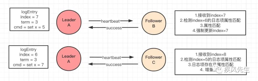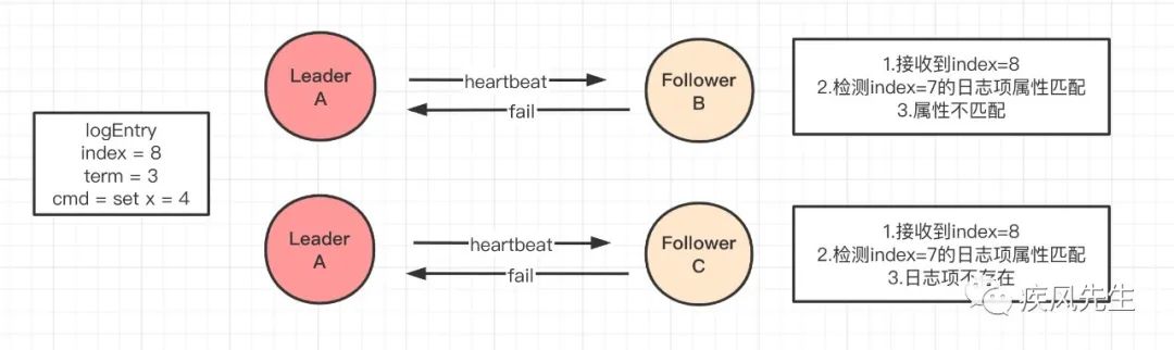 以上面的日志记录为例,leader节点当前的索引值为8,而follower节点A与follower节点B索引值分别为5和8,这个时候假设leader节点向集群follower节点通过RPC发送新的日志记录抑或是心跳消息.此时follower节点A与B将会进行一致性检查.