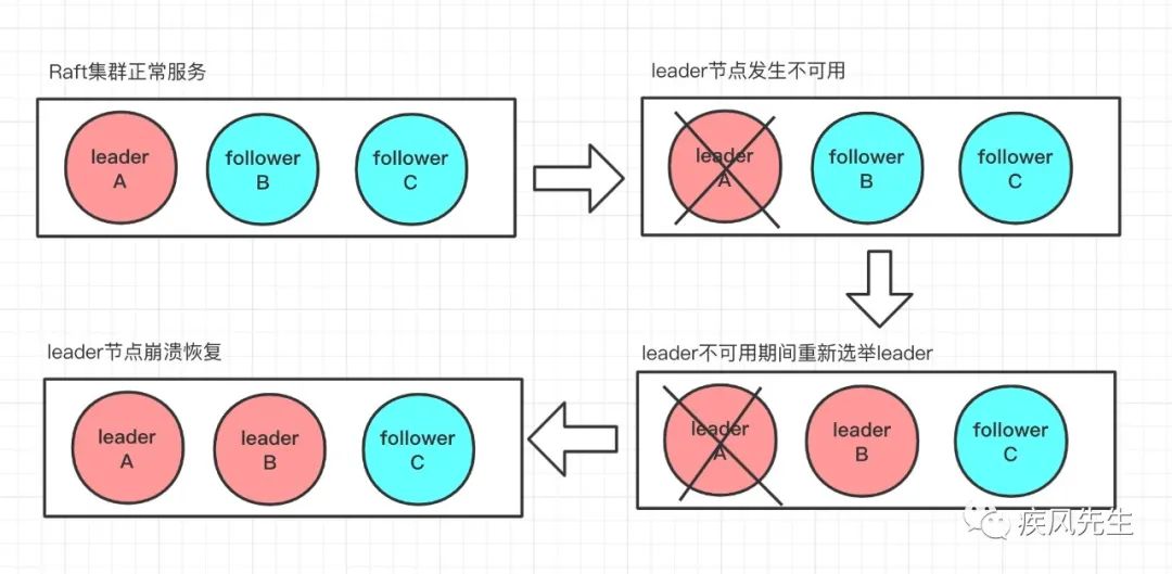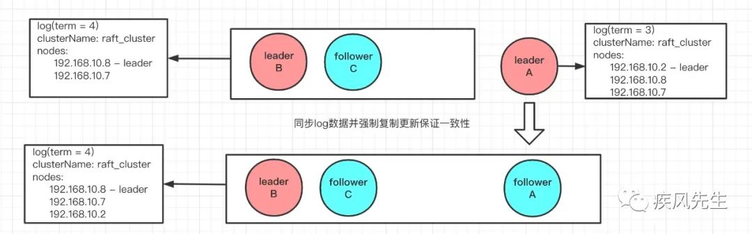 从上面我们可以看到在一个Raft集群服务中,如果leader节点发生不可用,那么剩下的follower节点将会重新进行选举,假设此时选举B作为leader节点,那么当原有的leader节点恢复正常的时候,此时集群存在两个“leader”节点,如何解决?