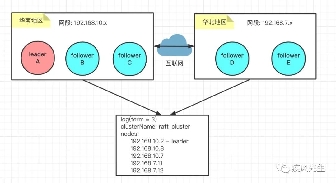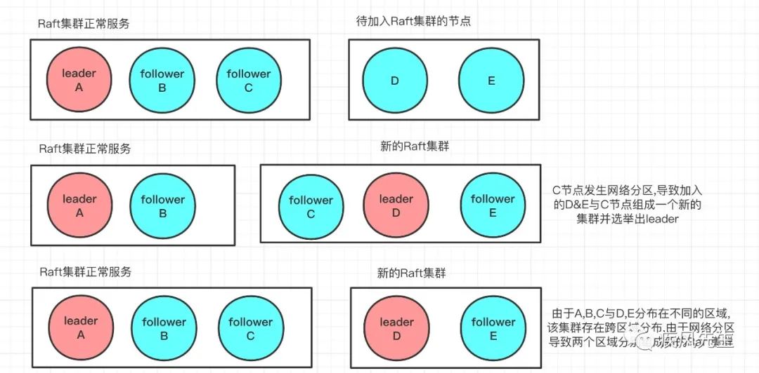 从上述可以看到,在实现集群服务节点的扩容时,如果新加入的服务节点刚好碰上原有的集群服务发生网络分区,导致C与B,A节点失去联系,而在C节点恢复的时候与刚加入的服务节点D&E组成一个新的Raft集群(D&E与原有的服务节点属于同一个区域内);其次如果是新加入的两个节点与原有的服务节点不属在同一个区域,那么当前raft集群扩容就存在跨区域的集群,跨区域必然会存在网络不可靠的因素,因此一旦两个区域发生网络分区错误,那此时新区域下的D&E以及原有的区域集群节点分别组成了一个Raft集群,此时就会面临双leader节点问题.