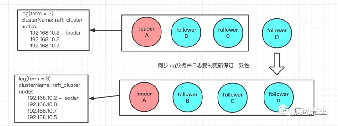 在现有的Raft集群中加入节点D,此时集群raft_cluster监听到节点D加入集群,此时leader节点更新集群的配置并向节点D同步日志数据log,最后更新集群配置之后再向Raft集群服务节点发起日志复制的RPC请求消息同步最新的集群配置信息从而保证Raft集群的强一致性.