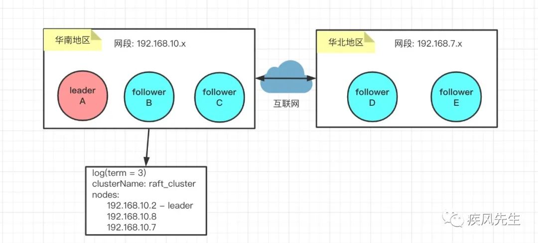 初始化状态,只有华南区域部署Raft集群服务,但因业务需求原因,需要在华北地区增加机器节点,并加入到现有的Raft集群服务,即: