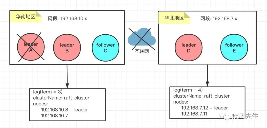 如果两区域的网络发生分区,那么就会导致Raft集群服务在不同的区域中产生两个leader节点,即:
