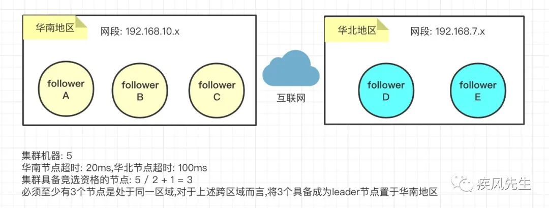 基于上述的现象,发生网络分区错误最有可能的原因就是网络超时,于是可以针对分区域的不同节点设定对应的超时时间,比如可以将华北区域的节点超时时间变长(等待心跳检查以及选举leader的超时时间)