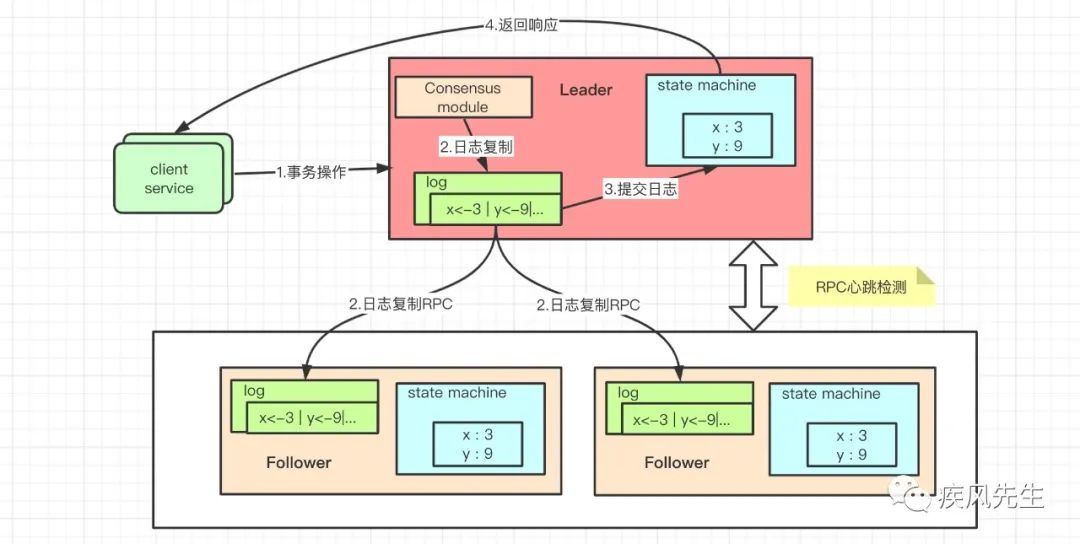 leader投票选举请求: 通过候选节点发起RPC的投票请求,集群其他节点在指定的timeout内接收到投票请求并按照先来先得的顺序进行投票. 日志复制请求: 集群服务的leader节点接收到事务操作执行事务指令并发起RPC请求对事务指令复制到事务操作日志log中并同步到集群其他服务节点 leader与follower节点心跳维持: leader节点发起RPC并携带任期Term信息的心跳检测,以此来维持集群服务leader节点与follower节点之间的健康检测状态,保证集群服务的可用性.