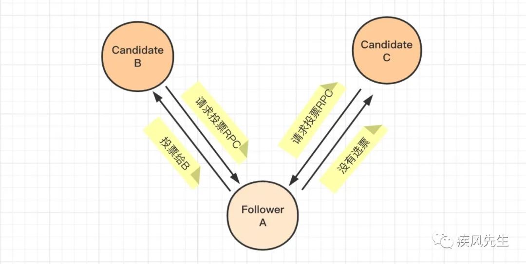 Follower节点接收到Candidate节点的任期投票,若当前的follower节点任期比投票选举的任期小且是在超时的时间范围内,那么当前Follower节点就会为发起投票的请求节点进行选举并给予响应