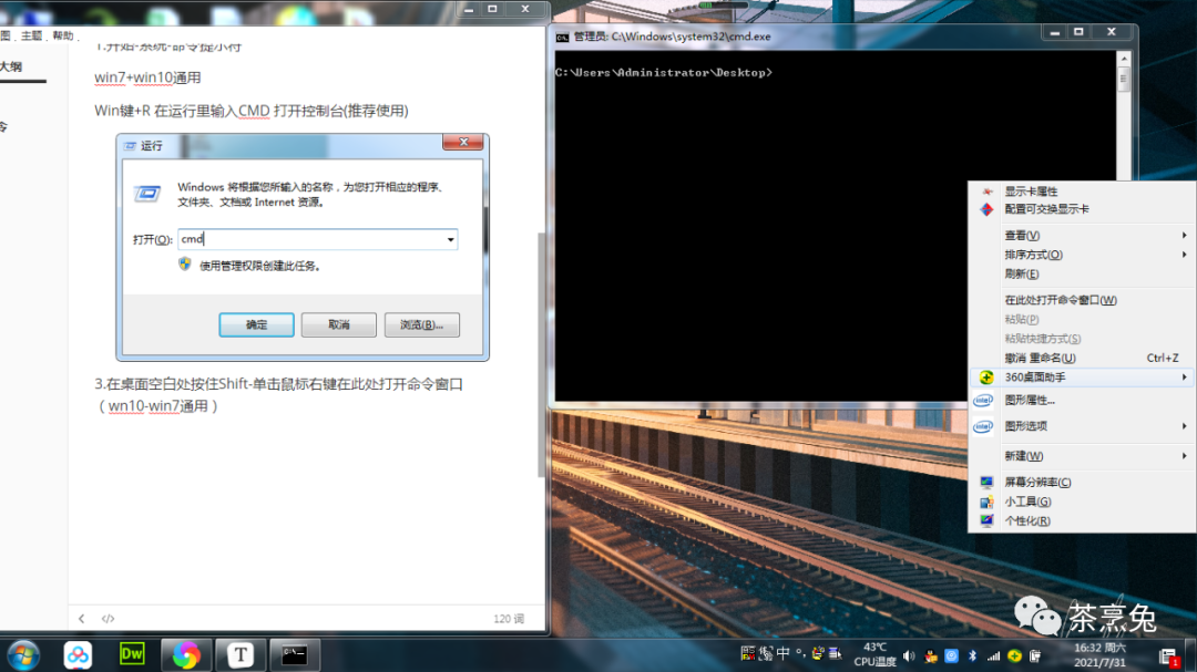 3.在桌面空白处(或任意文件夹下)按住Shift-单击鼠标右键在此处打开命令窗口(wn10-win7通用)