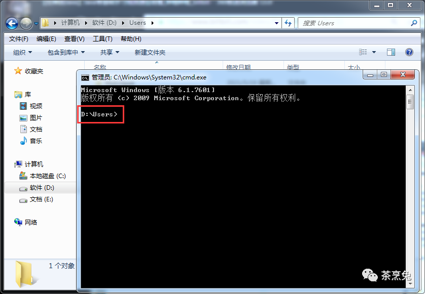 在资源管理器的地址栏盘符的前面输入cmd+空格+回车,在当前文件夹打开命令窗口!
