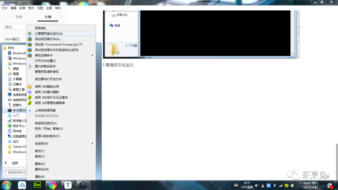 win7-开始-附件-命令提示符-鼠标右键以管理员身份运行