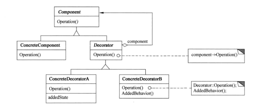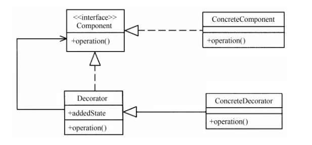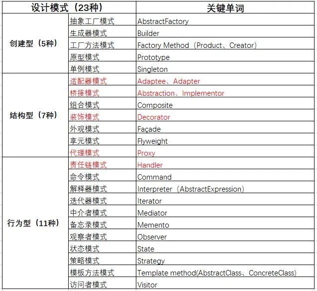 (2)结构型模式:适配器模式、桥接模式、装饰(器)模式、组合模式、外观模式、享元模式、代理模式。