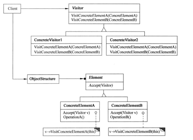 (23)访问者模式:表示一个作用于某对象结构中的各元素的操作。它允许在不改变各元素的类的前提下定义作用于这些元素的新操作。