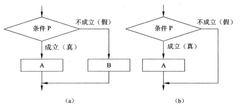 选择结构提供了在两种或多种分支中选择其中之一的逻辑。基本的选择结构是指定一个条件P,然后根据条件的成立与否决定控制流走A还是走B,只能从两个分支中选择一个来执行,如下图(a)所示。这种结构经常用if...else语句来表示,格式为: