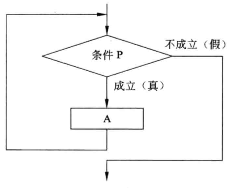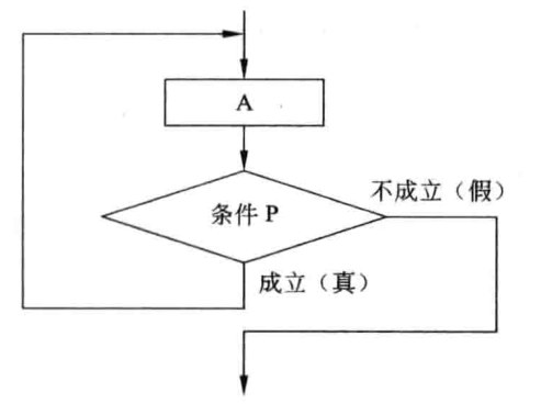 do-while型结构的逻辑含义是先执行循环体A,然后再判断条件P,若成立则继续执行循环体A的过程并判断条件;否则,控制就退出重复结构,如下图所示。