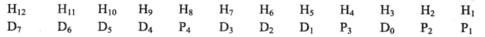 例如,对于8位的数据位,进行海明校验需要4个校验位。令数据位为D7、D6、D5、 D4、D3、D2、D1、D0, 校验位为P4、P3、 P2、 P1,形成的海明码为H12、H11、... 、 H3、 H2、 H1,数据位与校验位在海明码中的位置如下所示: