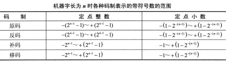 设机器字长为n,各种码制下带符号数的范围如下表所示: